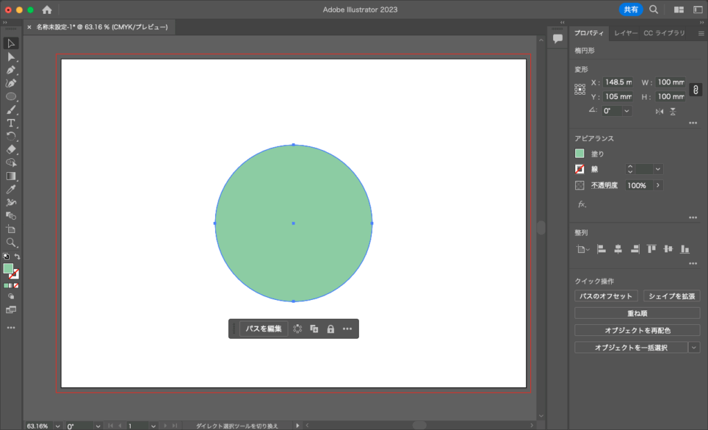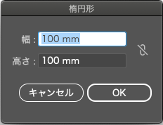 ツールバーから楕円形ツールを選択し、アートボード上をクリック。ダイアログで幅(W)と高さ(H)にそれぞれ「100 mm」を入力してOKを押します。