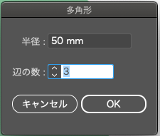 ツールバーから多角形ツールを選択し、アートボード上をクリック。ダイアログで「半径:50 mm」「辺の数:3」を入力してOKを押します。