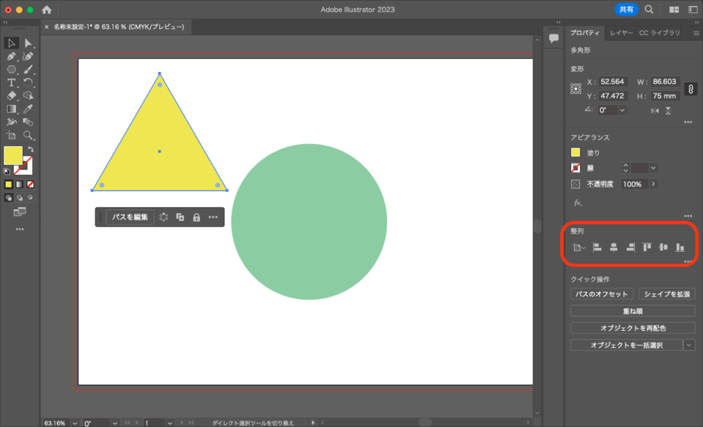 この時、上下の中央揃えにすると、円と正三角形の中心は異なっているので図形がズレてしまいます。内接する図形の場合は、左右の中央、そして円の上部に揃えるように整列させることがポイントです。