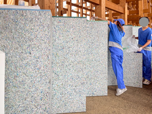 恐らくペットボトルなどのプラスチックを回収して粉末状のペレットにして、そこからゴミ箱に再成形したものだと思います。