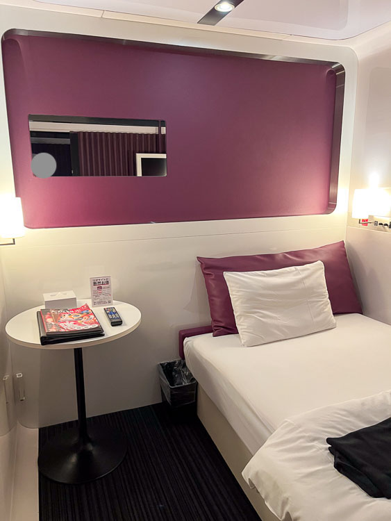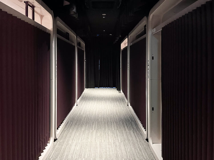 キャビン内での飲食は禁止です。館内には軽食カフェとフロント脇の飲食スペースがあり、外食か買ってきたものをそちらで食べる形になります。部屋でお酒を楽しみたい派には不向きです。