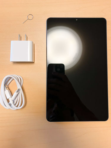 同梱物は、Type-Cの充電ケーブルとSIM用のピン