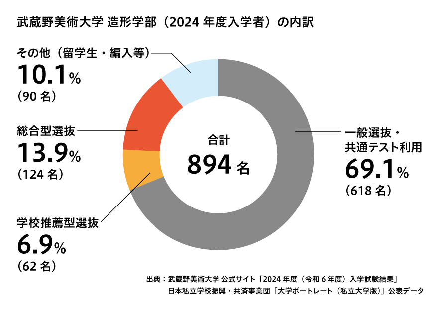 【解説】 では、美大はどうか。武蔵野美術大学の伝統的な学科が集まる「造形学部」のデータを見ると、私大全体のトレンドとは大きく異なります。 一般選抜・共通テスト利用での入学者が全体の約7割(69.1%)を占めており、美大において「デッサン力」や「構成力」といった実技スキル、そして「基礎学力」という基礎体力が依然として極めて重要視されていることがわかります。この学部を目指すなら、手の訓練と勉強は欠かせません。