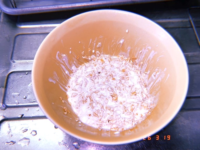 - 容器にオートミールと砂糖を入れ、ヨーグルト(または牛乳)を注いでかき混ぜる。