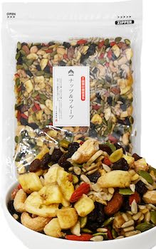 このミックスナッツ&ドライフルーツのパックは色々な種類が入っていて甘過ぎもしないので、リピートしています。